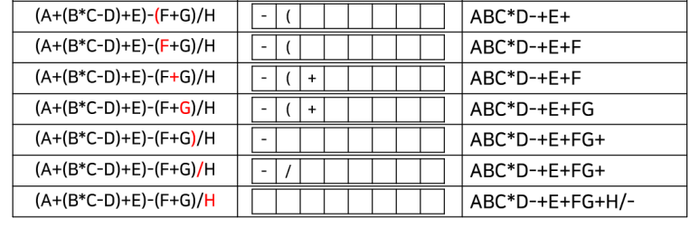 이를 그대로 코드로 구현하면 된다. 코드를 보기 전에 먼저 수동으로 직접 해보자. 아래의 식을 위 알고리즘에 따라 후위 표기식으로 변환해본다.
