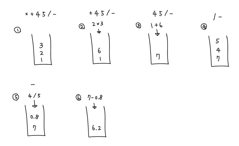 123*+45/-를 계산하는 예시를 살펴보자. 단, 스택에서 꺼낼 때 계산 순서가 (아래쪽) 연산자 (위쪽)임을 주의히자.