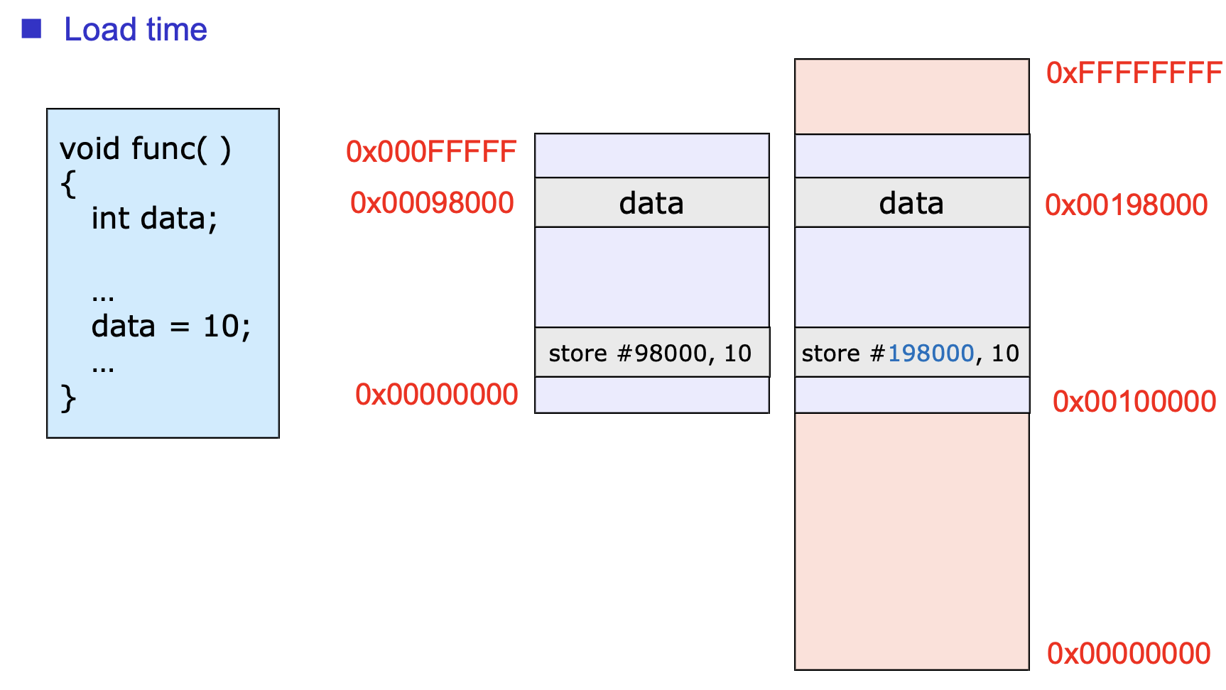 위에서 $98000은 논리적 주소를 뜻한다. 아까 주소 바인딩은 논리적 주소가 물리적 주소로 Mapping 되는 시점이라고 말했다. 위 예제에서 data의 물리적 주소는 compile time, load time, execution time에 결정될 수 있다. Relocation Register 값은 100000이라고 하자. 즉, 물리적 주소값은 198000이라는 뜻이다. 각각 어떻게 달라지는지 살펴보자.
