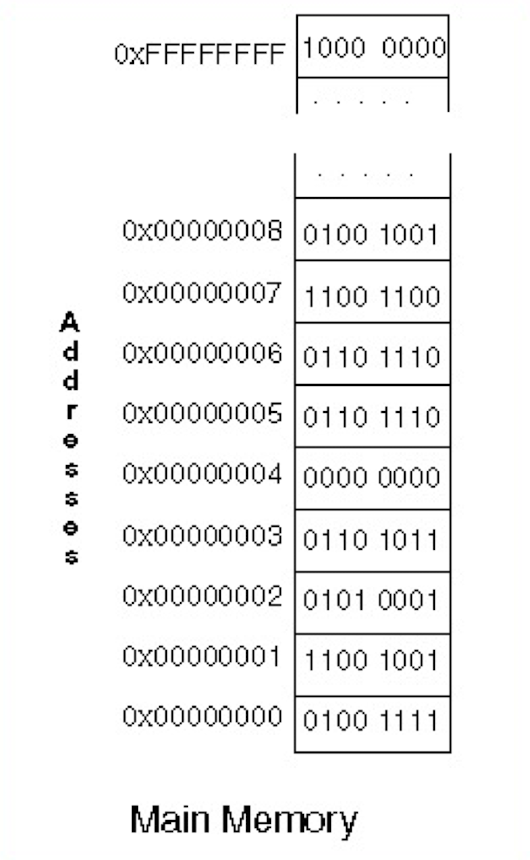 메모리의 주소 공간은 위와 같이 표현한다. CPU는 주소값을 통해 메모리에 접근할 수 있다. 위 예시에서 0번지 주소에 대응하는 명령어는 01001111 임을 알 수 있다. 그리고 메모리의 단위는 비트(bit)가 아니라 바이트(byte)다. 이를 꼭 기억하고 있기를 바란다. 즉, 위 그림에서 주소 한 칸은 1 byte의 데이터를 저장할 수 있다. 주소 공간이 2^32 라는 것은, 주소의 길이가 32비트라는 것이고, 이는 위 그림에서 저장할 수 있는 칸이 2^32개라는 뜻이다.