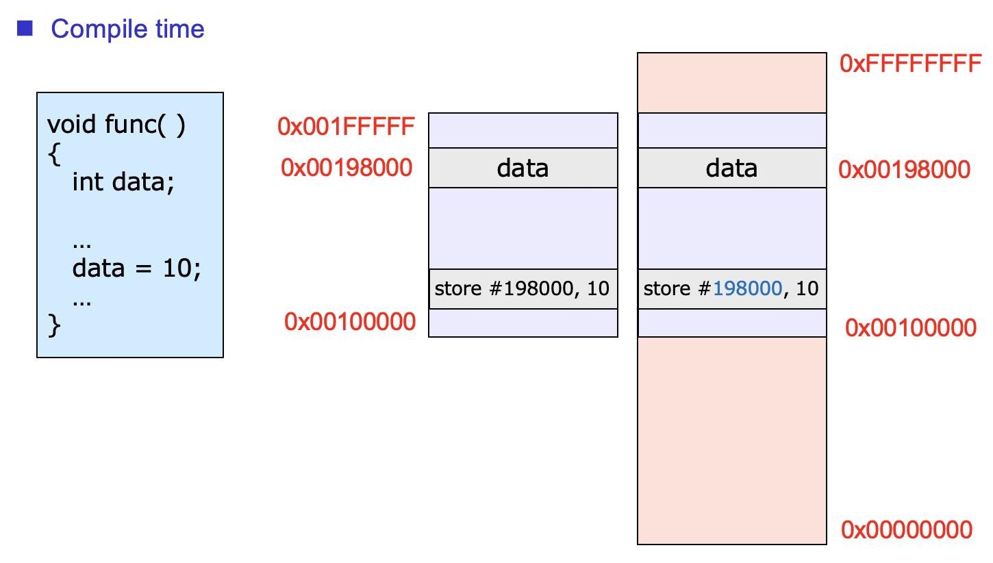 마지막 방법은 실행할 때 바꾸는 방법이다. 쉽게 말해서 code level 실행시 relocation을 해주는 것이다. code level이란 '코드 한줄'로 생각하면 된다. 위 그림의 경우 'data = 10;'이 실행될 때 비로소 논리적 주소를 물리적 주소로 바인딩 해주는 것을 확인할 수 있다. 그림에서 보이는 남색깔 동그라미는 '덧셈'을 뜻한다.