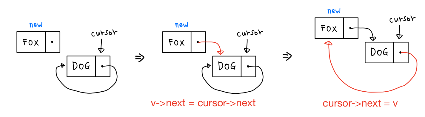 v->next = cursor->next; // v를 커서 뒤에 연결