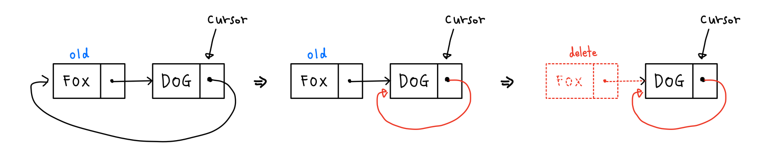 위 그림은 리스트에 값이 두 개 이상 있는 경우다. 커서의 next가 old의 next를 가리키도록 한 뒤에 old 노드를 삭제하면 된다. 이를 그대로 코드로 구현하면 아래와 같다.