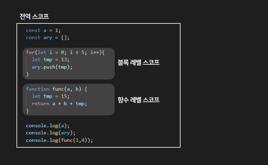 - 블록 레벨 스코프 : 코드 블록 내에서 선언된 변수는 코드 블록 내에서만 유효하며 코드 블록 외부에서는 참조할 수 없다.