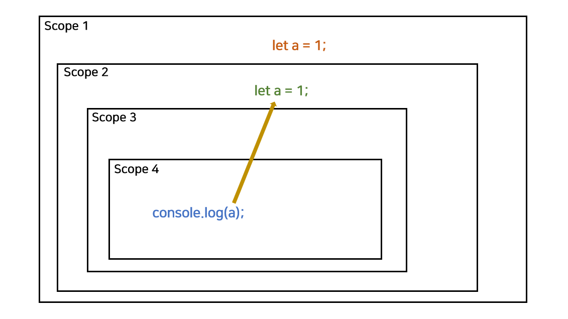 1) 내부 스코프는 외부 스코프를 참조할 수 있지만, 외부 스코프는 내부 스코프를 참조할 수 없다.
