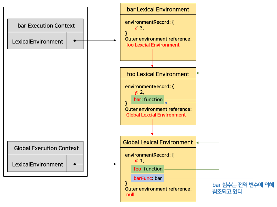 - bar 함수를 반환하면 전역 변수 barFunc와 연결된다. 즉, barFunc는 foo 렉시컬 환경의 bar 함수를 참조하게 되는 것이다.