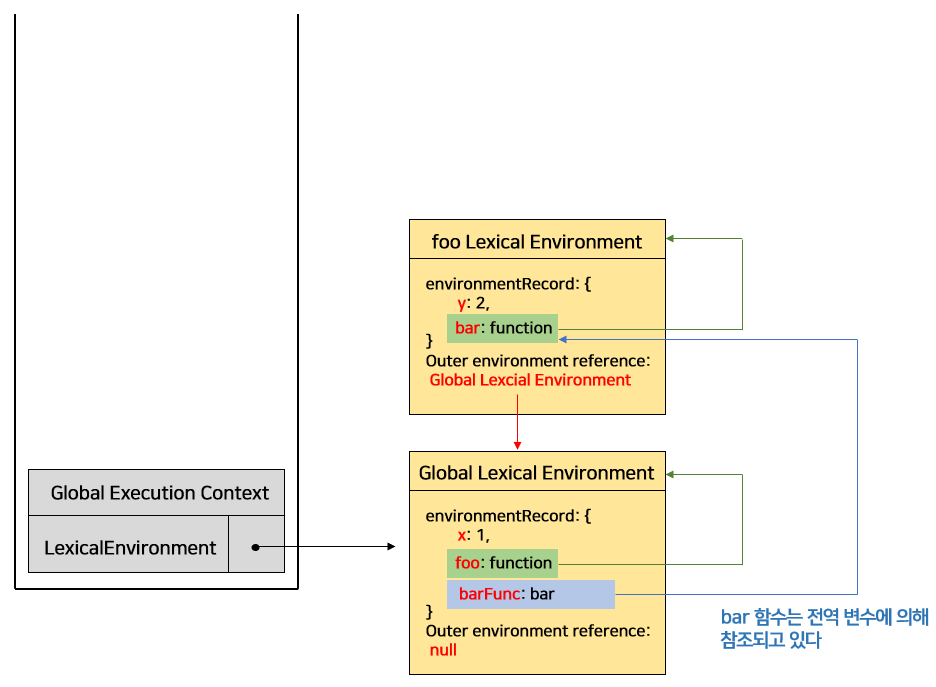- foo 함수의 생명주기가 종료되면 foo 실행 컨텍스트는 스택에서 제거된다. 하지만 전역변수 barFunc가 foo 렉시컬 환경 안의 함수를 참조하고 있으므로 foo 렉시컬 환경은 그대로 유지된다.