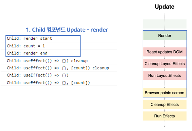Child 컴포넌트는 버튼을 클릭하면 1씩 증가하는 아주 단순한 컴포넌트다. show child 체크박스를 클릭하면 Child 컴포넌트가 mount 되고, 다시 체크박스를 클릭해 선택을 해제하면 unmount 되는 형태다. 예제 코도는 어렵지 않기 때문에 설명은 생략하겠다. 이제 Child Mount, Child Update, Child Unmount 될때 각각 콘솔창에 어떻게 출력되는지 살펴보자. 그전에 처음에 봤던 'Hook Flow Diagram'을 다시 한번 보고 오는 것을 추천한다. App 컴포넌트가 Mount 되고난 이후임을 유의하자.