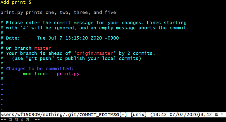 완료된 커밋을 수정하려면 어떻게 해야 할까요? 최신 커밋의 수정은 amend 명령어로 할 수 있습니다. 최신 커밋을 수정하기 위해 먼저 원래 코드에서 수정할 부분을 수정해주시고 저장해주세요. 저는 기존의 print(4)를 print(5)로 바꿔보겠습니다. git bash 터미널에 ' git commit --amend' 명령어를 입력하면 기존의 커밋 메시지를 수정할 수 있습니다. 알맞게 수정한 뒤에 Esc + : + w + q 로 나가주세요!