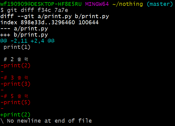 여기서 --- 기호가 붙은 것들이 해당 커밋 이전의 내용들이고, +++ 기호가 붙은 것들이 해당 커밋의 내용입니다. 이전 커밋에서는 print(2), print(3)을 추가했고, 이번 커밋에서는 print(4)를 추가한 것을 볼 수 있습니다.