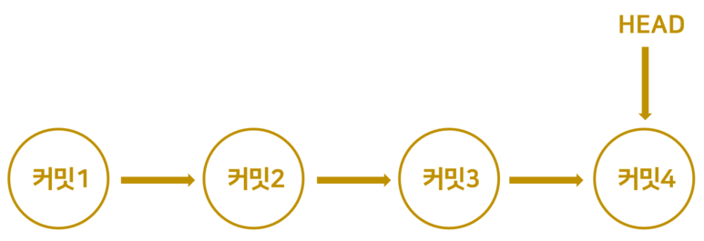 커밋은 연결 리스트 형식으로 저장되어 있습니다. git log로 커밋 이력들을 살펴보면 가장 최신 커밋에 'HEAD→MASTER'라고 적혀있습니다. HEAD는 가장 최신 커밋을 가리키고 있습니다. 그림으로 보면 저장된 커밋들은 아래와 같은 구조를 이루고 있습니다. 사실 엄밀하게 말하면 HEAD는 브랜치를 가리키는데 이는 브랜치를 배우고 나서 다시 자세히 다루겠습니다.
