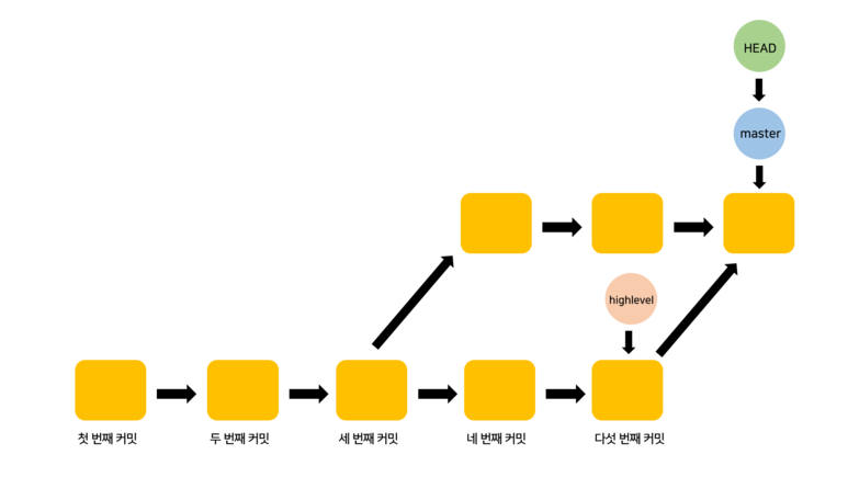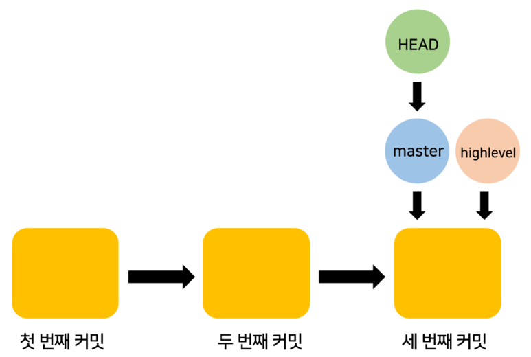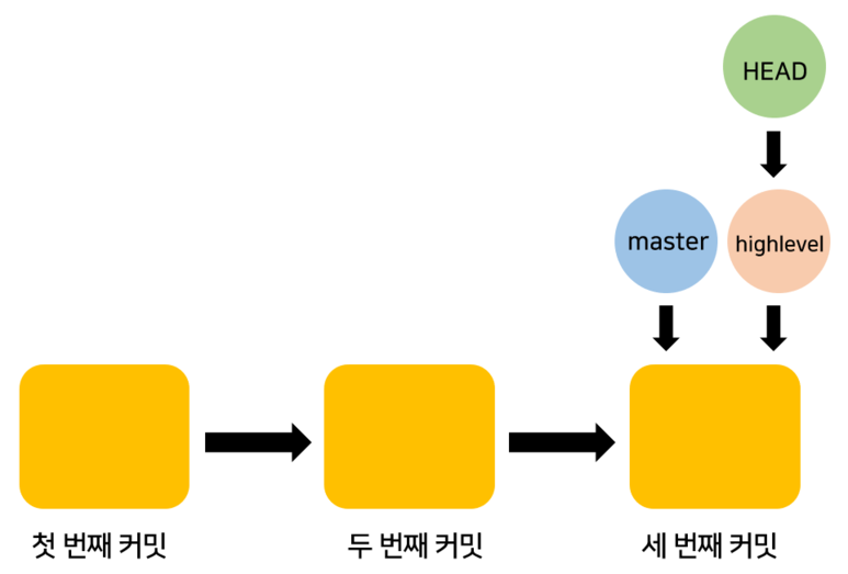 이게 진짜 모습입니다. 커밋을 하면 HEAD가 가리키는 브랜치가 최신 커밋으로 이동하게 됩니다. 그럼 좀 더 나아가서 highlevel 브랜치를 만들면 어떻게 될까요? highlevel 브랜치를 만들면 아래 그림처럼 HEAD가 가리키던 커밋을 highlevel 브랜치가 가리키게 됩니다.