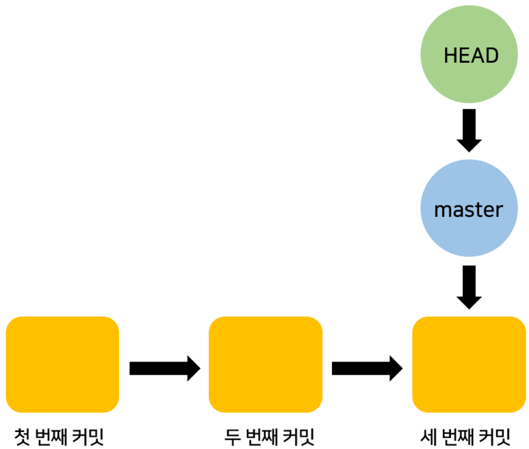 사실 HEAD와 branch는 포인터입니다. 포인터는 무엇을 가리키는 것을 말합니다. 이전에 HEAD를 설명할 때 HEAD는 커밋을 가리킨다고 했었죠? 하지만 엄밀하게 말하면 HEAD는 브랜치를 통해 간접적으로 커밋을 가리키고 있습니다. 항상 그런건 아니지만 대부분 그렇습니다. 예외적인 부분은 checkout과 reset의 차이를 설명드릴 때 다시 다루겠습니다. 자, 그러면 HEAD와 branch는 어떻게 구성되어 있는지 그림으로 살펴보겠습니다.