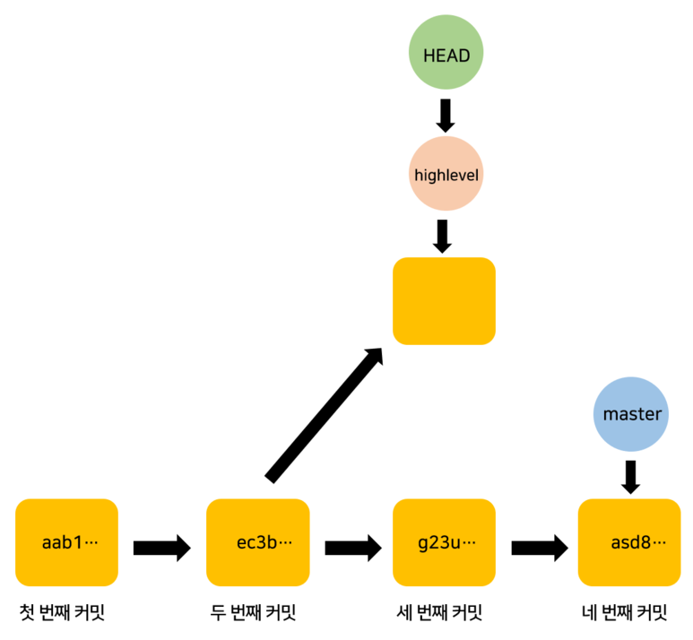 checkout은 해드의 이동이기 때문에 브랜치를 가리키도록 설정할 수도 있습니다. 하지만 이는 이미 전에 다뤘었습니다. 브랜치 이동 명령어가 ' git checkout ~' 였죠? 해드가 highlevel 브랜치를 가리키도록 하고 커밋을 진행하면 아래와 같이 됩니다.