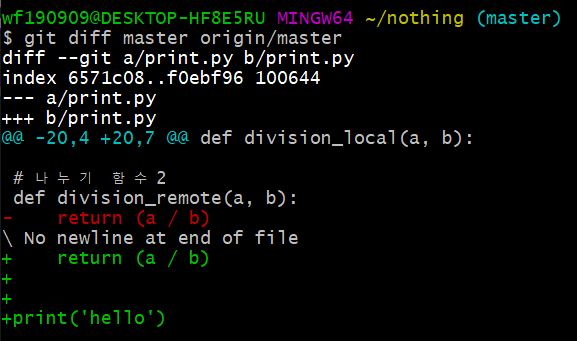 이제 로컬 레포지터리와 리모트 레포지터리를 비교해보겠습니다. git diff master origin/master 명령어를 입력하면 됩니다.