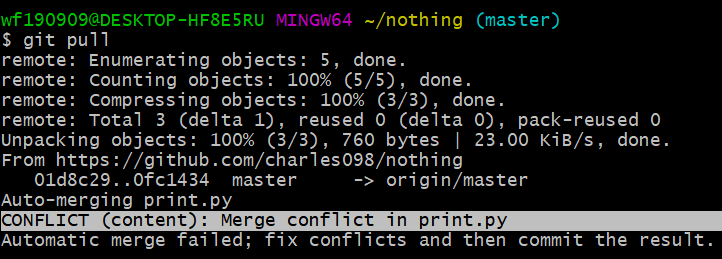 그런데 merge conflict가 발생했습니다! 그 이유는 리모트 레포지터리의 최신 커밋들을 가져와서 병합하는 과정까지가 git pull이기 때문입니다. conflic를 해결하는 방법은 working directory로 가서 직접 수정해주면 된다고 했었죠?