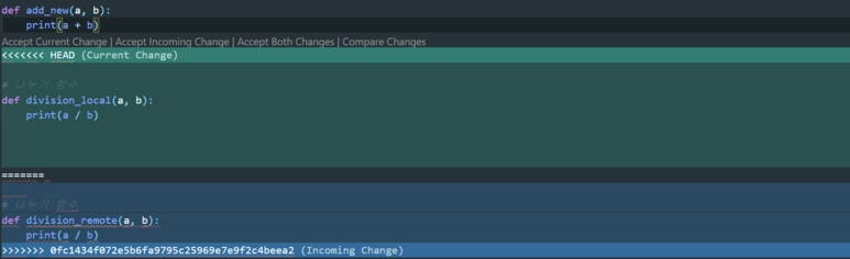코드를 아래와 같이 바꿔준 다음에 커밋을 하면 충돌이 해결됩니다.