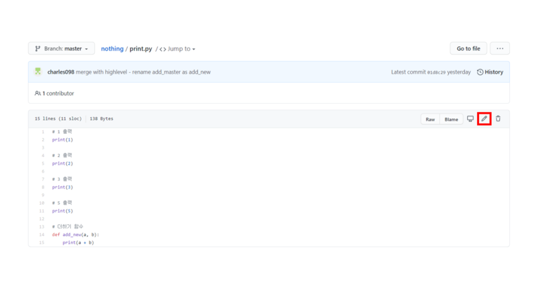 만약에 로컬 레포지터리에서 푸시를 해주고 다음 푸시를 해주기 전에 리모트 레포지터리에 변화 생기면 어떡할까요? 한번 해보겠습니다. 먼저 깃허브로 가서 마스터 브랜치의 내용을 수정해보겠습니다.