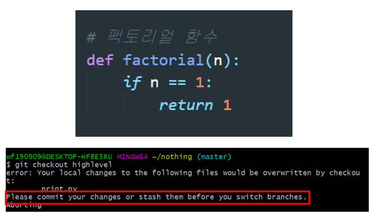마스터 브랜치에서 작업을 하다가 아직 커밋을 하지 않았는데 급하게 다른 브랜치로 가야할 일이 생길 수 있습니다. 물론 커밋을 하고 가면 되겠지만 작업이 끝나지도 않았는데 커밋을 하면 쓸모없겠죠? ' git stash ' 를 입력하면 최신 커밋 이후의 작업들을 저장할 수 있습니다. 마스터 브랜치에서 미완성된 팩토리얼 함수를 커밋하지 않고 highlevel 브랜치로 이동해보겠습니다.