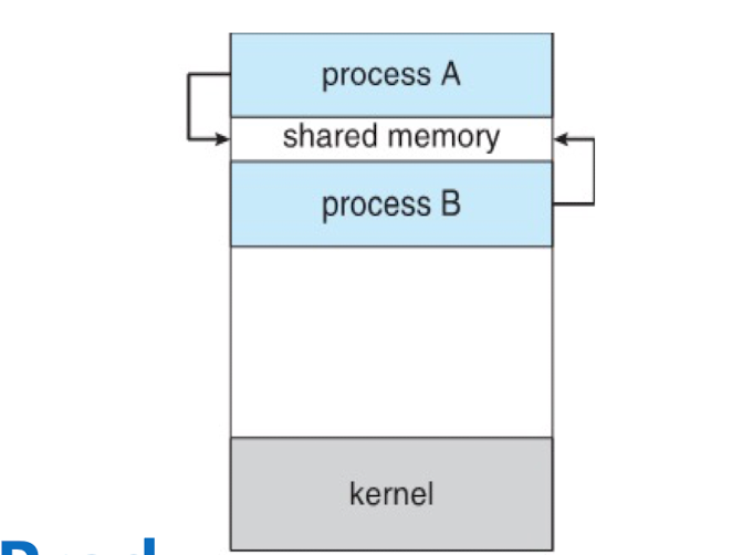 두 개 이상의 프로세스들이 주소 공간의 일부를 공유하며, 공유한 메모리 영역에 읽기/쓰기를 통해서 통신을 수행하는 방법이다. 시스템 콜을 통해 공유 메모리가 설정되면, 그 이후의 통신은 커널의 관여 없이 진행 가능하다.