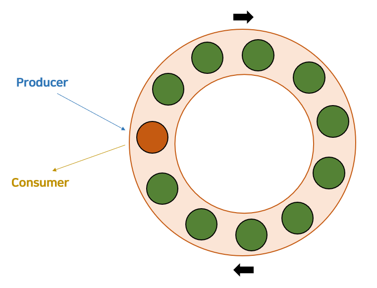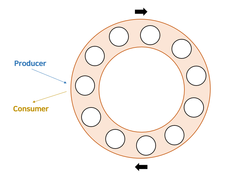 공유 메모리가 가득 찬 경우 발생할 수 있는 문제다. Producer가 가득 찬 지 모르고 쓰기를 진행한 상황이다. Consumer가 읽지도 않았는데 overwite 한 것이다. 그림으로 표현하면 아래와 같다. 초록색 원은 기존에 쓴 것을, 적색 원은 덮어쓴 것을 표현한 것이다.