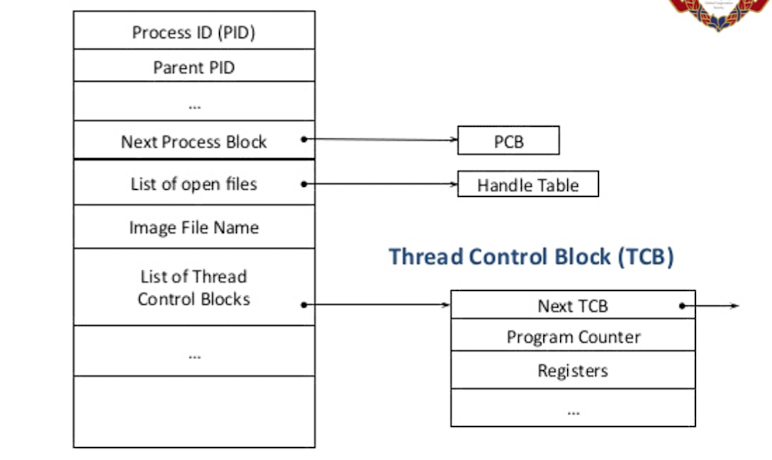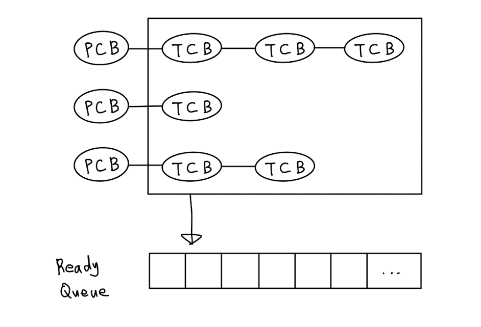 그렇다면 쓰레드는 누가 관리할까? 프로세스는 PCB에 의해 관리된다. 쓰레드도 똑같이 TCB라는 녀석이 관리한다. 이름이 Process에서 Thread로 바꼈을 뿐이다. TCB는 PCB에 연결 리스트 형태로 붙어있다. 그림으로 보면 아래와 같다.