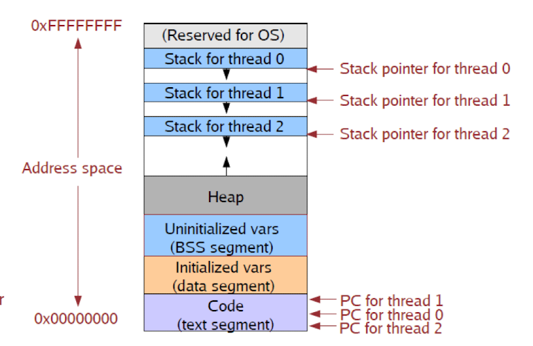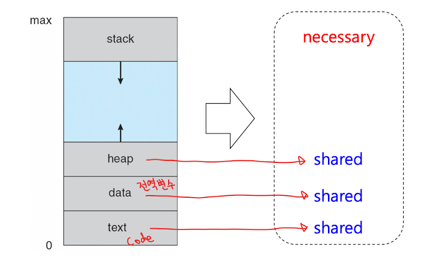 그렇다.. 사실 stack 부분만 달라도 상관 없다. 조금 더 자세하게 들어가면 CPU register, stack, program counter 값은 달라야 한다. 하지만 text~heap 부분은 같아도 상관 없다. 그러면 공유 하는 부분은 같이 쓰고, 따로 쓰는 부분만 구분하면 되지 않을까? 그래서 나온 게 쓰레드다. 쓰레드의 구조는 아래와 같다.