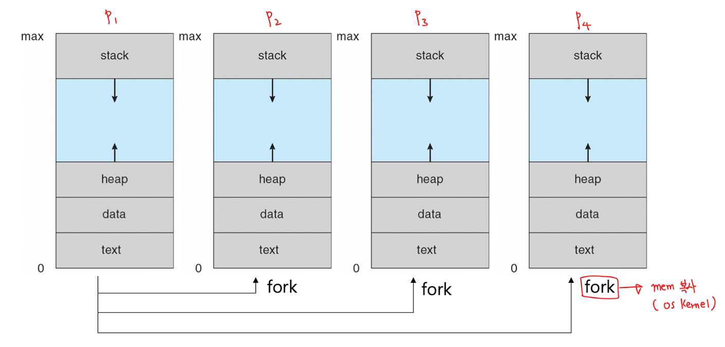 쓰레드는 프로세스의 단점을 보완한 새로운 실행 단위다. 사실 이전에 프로세스가 CPU의 실행 단위라고 했는데 사실은 쓰레드가 맞다. 이전까지는 엄밀히 말해서 '단일 쓰레드'라고 할 수 있다. 프로세스의 치명적인 단점은 fork()를 할 때 자식 프로세스에게 code~stack까지의 모든 메모리 공간을 새롭게 할당한다는 점이다. 이는 심각한 메모리 낭비다. 이해하기 쉽게 그림으로 알아보자.