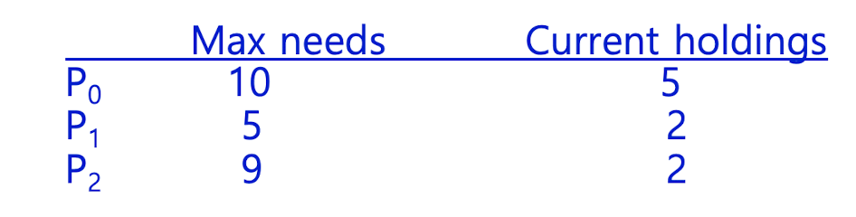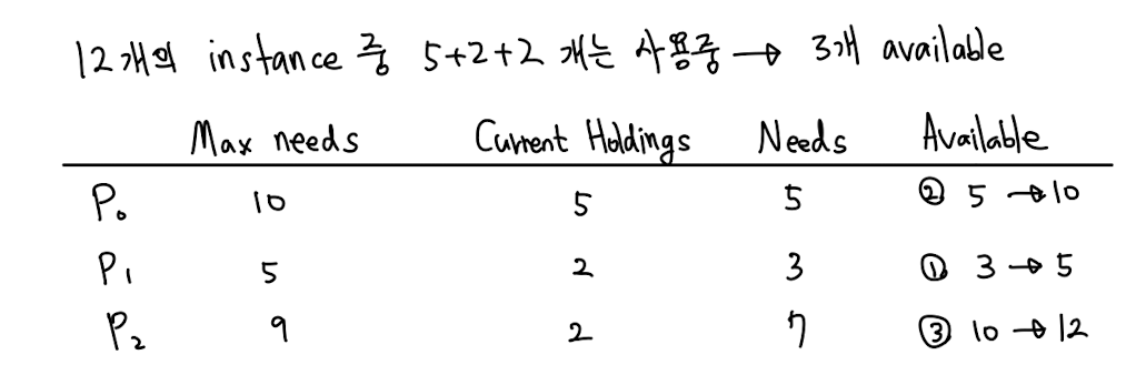 예를 들어 프로세스 A가 현재 세 개의 자원을 사용하고 있고 필요한 자원의 총 개수가 다섯 개라면, 두 개의 자원을 추가로 할당받아야 다섯 개의 자원을 해제할 수 있다는 말이다.
