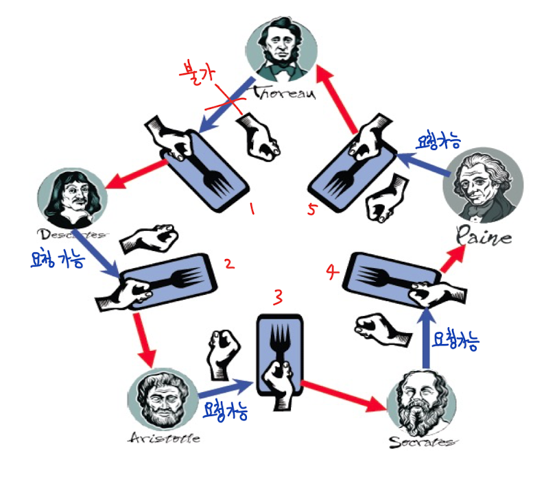 북쪽에 앉은 철학자는 포크1을 집기 위해 우선 우선순위가 낮은 포크5를 내려놓아야 한다. 포크5를 내려놓으면 북동쪽에 앉은 철학자가 식사를 할 수 있게 되고 데드락은 풀리게 된다.