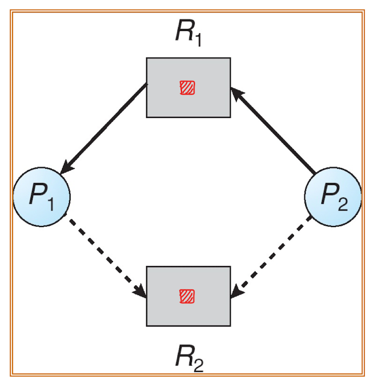 데드락 회피는 안전한 상태로만 가도록 하는 방법이기 때문에 위 예시의 경우 P2 → R2 요구는 기각되고 P1 → R2 요구를 수락하게 된다.
